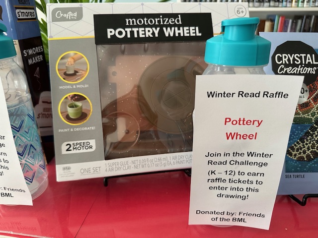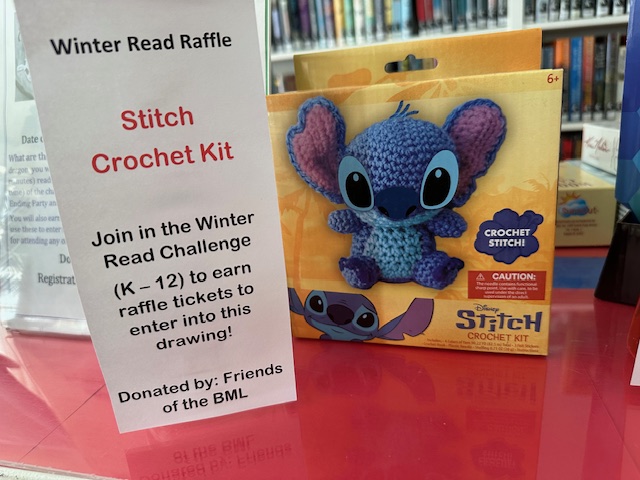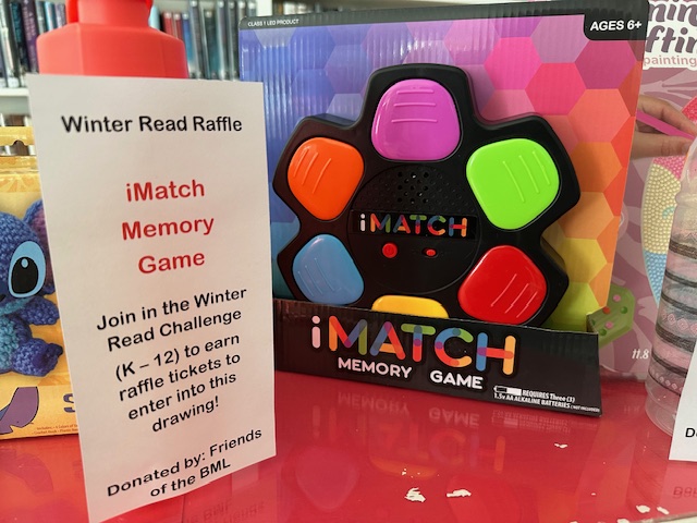 Young people in grades K-12th can earn raffle tickets for raffle prizes by taking the 2026 Winter Read Challenge. Participants will earn raffle tickets for every 120 minutes (two hours) or reading up to 840 minutes (14 hours). Participants need to log their reading time on a log sheet and bring to the library to get raffle tickets to put in for the raffle prize of their choice. For 2026 Winter Read Challenge rules click here.
